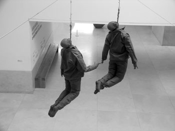 Uma pequena multidão de homens cinzentos, rostos sorridentes e idênticos, remete-nos ao uniformidade do colectivo, às pequenas perdas momentâneas de individualidade. O que se altera de imediato quando as observamos de cima e tomamos consciência do papel único de observadores, benesse conferida pela organização do espaço da exposição.